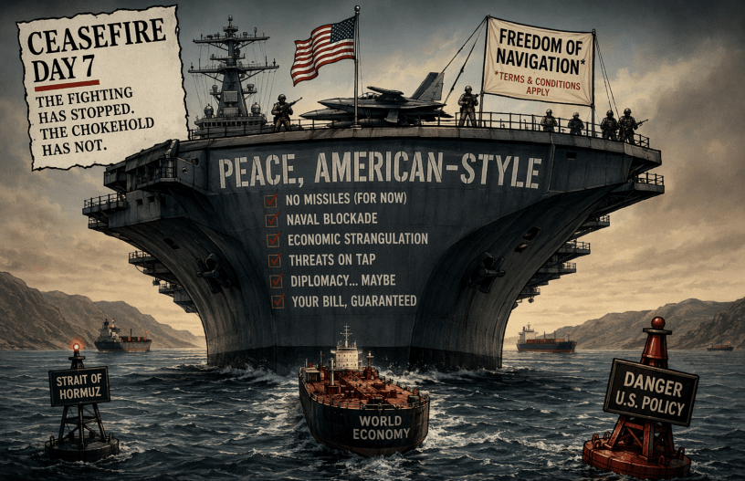 What America produced in the first week of this supposed ceasefire with Iran was not peace. It was not even a convincing impersonation of peace. It was a naval chokehold, a fresh round of threats, stalled diplomacy, snarled shipping, allies quietly freaking out, and an economic kick in the teeth for everyone from truckers to farmers. This is not what peace looks like. This is what happens when the empire wants the violence to continue, but in a form that sounds less embarrassing on Sunday morning talk shows.